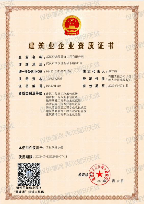 武漢好來屋裝飾工程有限公司成立于2002年3月,是一家以室內(nèi)外裝飾、建筑涂裝、建筑幕墻為一體的專業(yè)裝飾(管理)公司,公司現(xiàn)已取得湖北省建設(shè)廳建筑裝修裝飾工程專業(yè)承包壹級、建筑幕墻工程專業(yè)承包壹級、建筑工程總承包貳級、鋼結(jié)構(gòu)工程專業(yè)承包貳級、地基基礎(chǔ)工程專業(yè)承包貳級、消防設(shè)施工程專業(yè)承包貳級、防水防腐保溫專業(yè)承包貳級資質(zhì)。