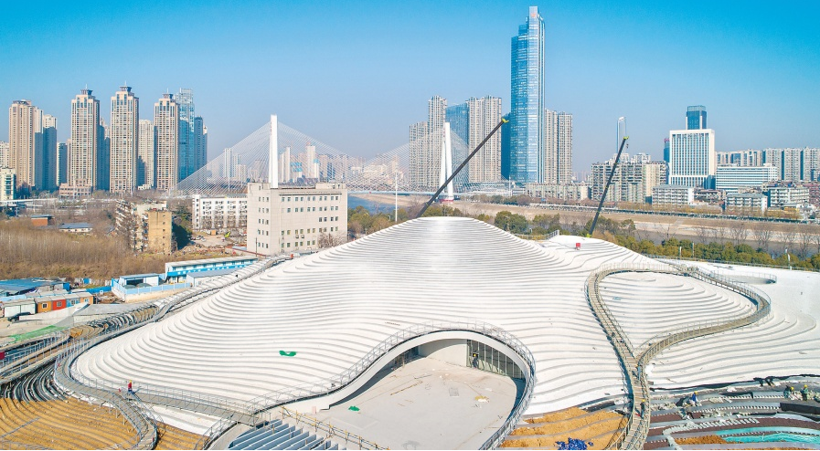 武漢美術館(琴臺館)位于漢陽知音大道77號,與琴臺大劇院和琴臺音樂廳構成文化場所矩陣,兩側有月湖公園和漢陽江灘,配備有大型停車場。為了使琴臺館與周邊環境相融合,特別是減輕建筑體量對自然湖面的壓迫,場館向月湖的方向采用了起伏的自然地形造型,遠觀仿佛一片“銀白梯田”,從空中俯瞰又似一顆石子擲進湖心激蕩起的一圈圈漣漪。