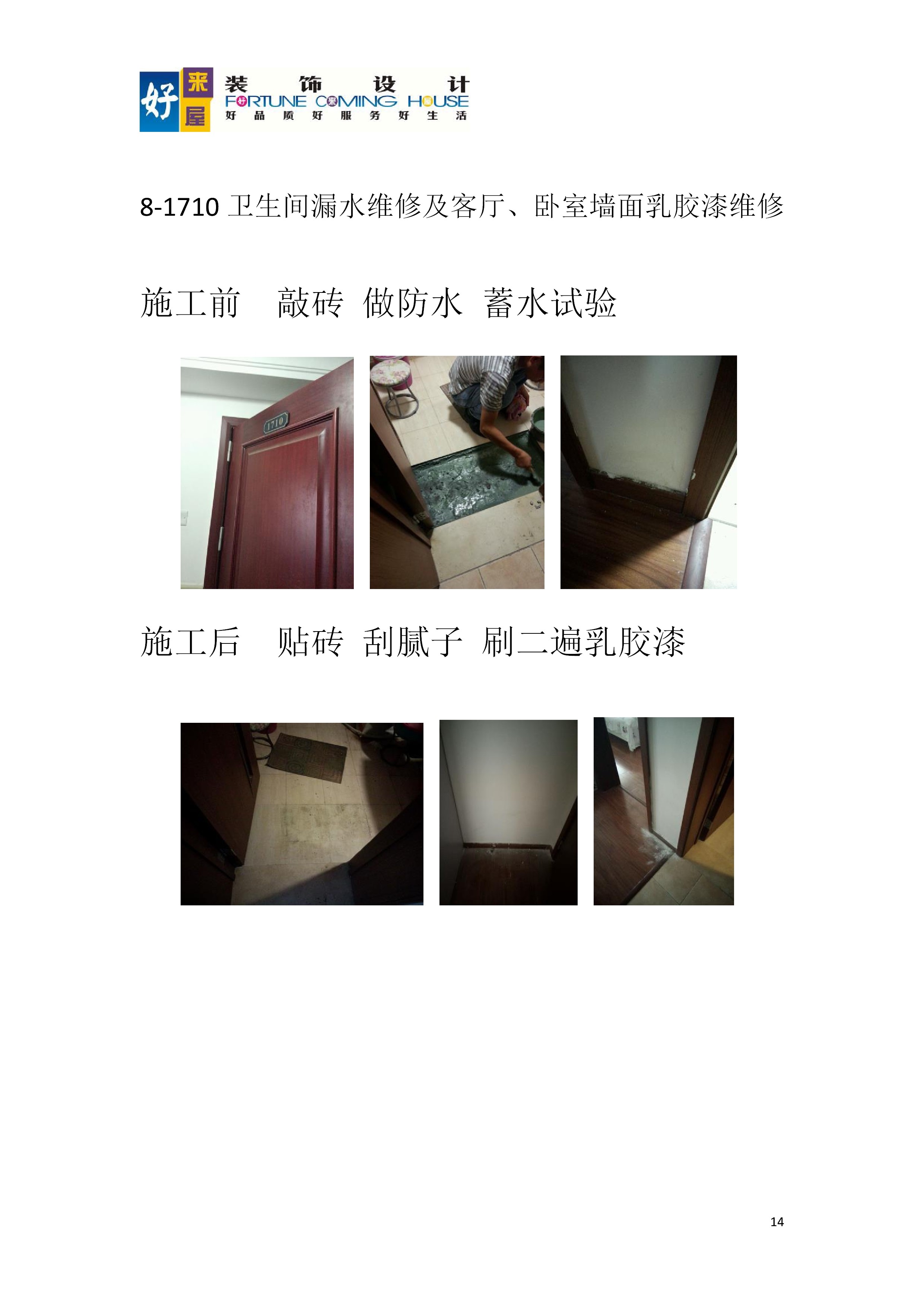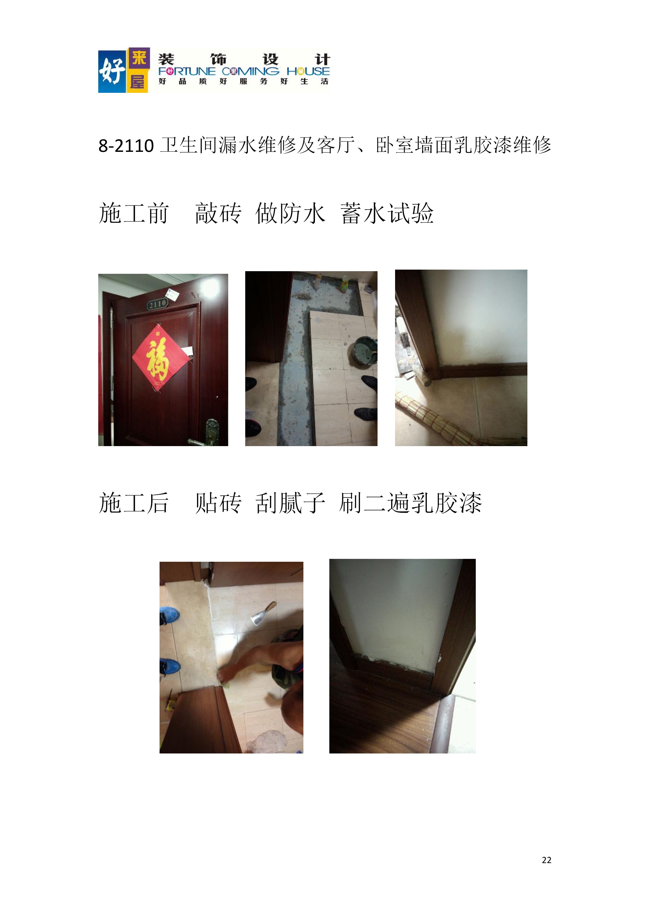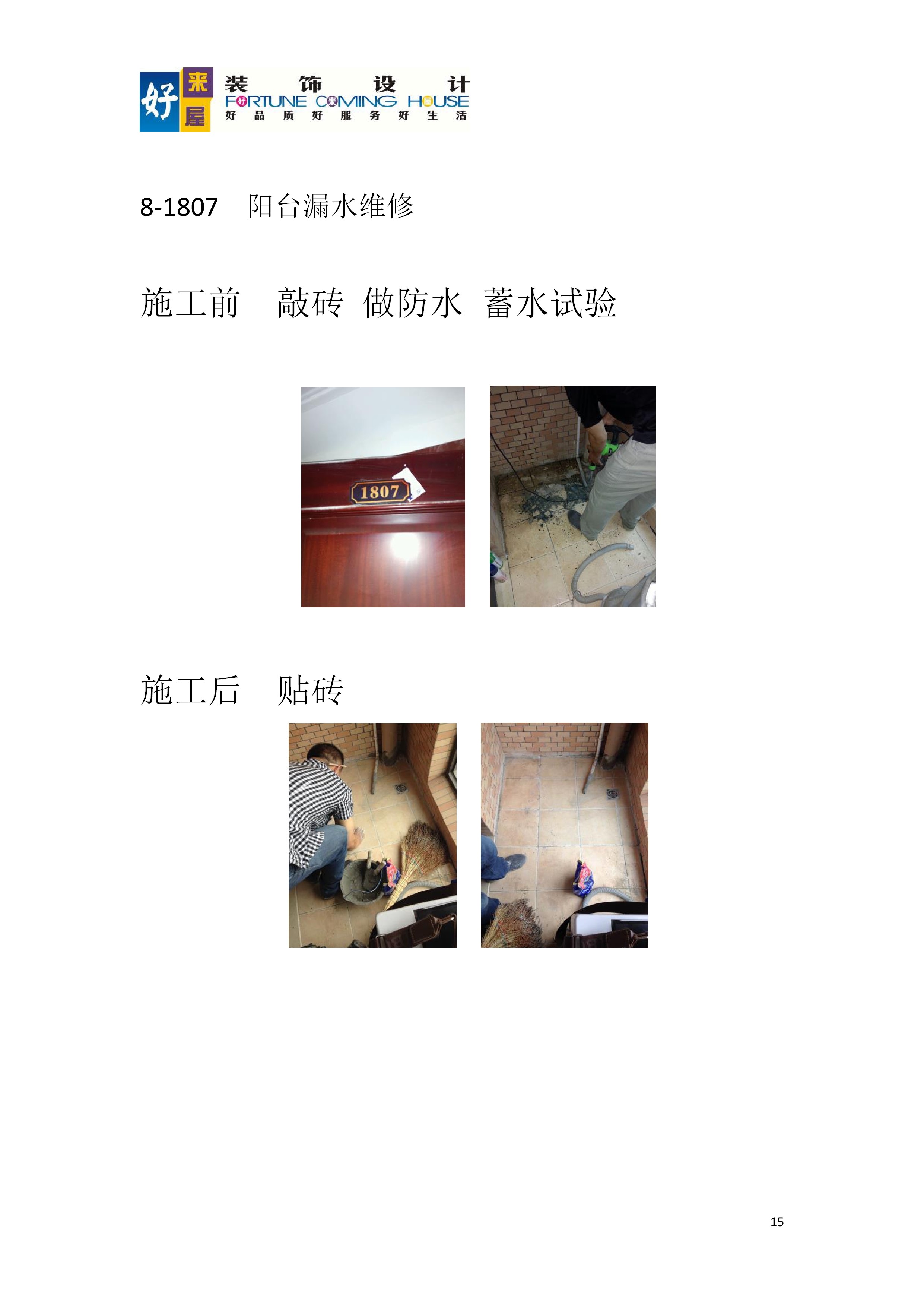 愛(ài)家國(guó)際華城我司施工總戶數(shù)為300戶,據(jù)我們現(xiàn)場(chǎng)施工人員統(tǒng)計(jì),存在漏水情況戶數(shù)為21戶,其中5家陽(yáng)臺(tái)漏水,16家衛(wèi)生間漏水。維修率占7%,漏水平均面積為1m2。我司在2014年8月16日接到愛(ài)家國(guó)際華城物業(yè)漏水維修電話后,在一個(gè)多月的時(shí)間里,快速的為客戶解決了房屋漏水維修問(wèn)題,體現(xiàn)好來(lái)屋高效率的辦事風(fēng)格。