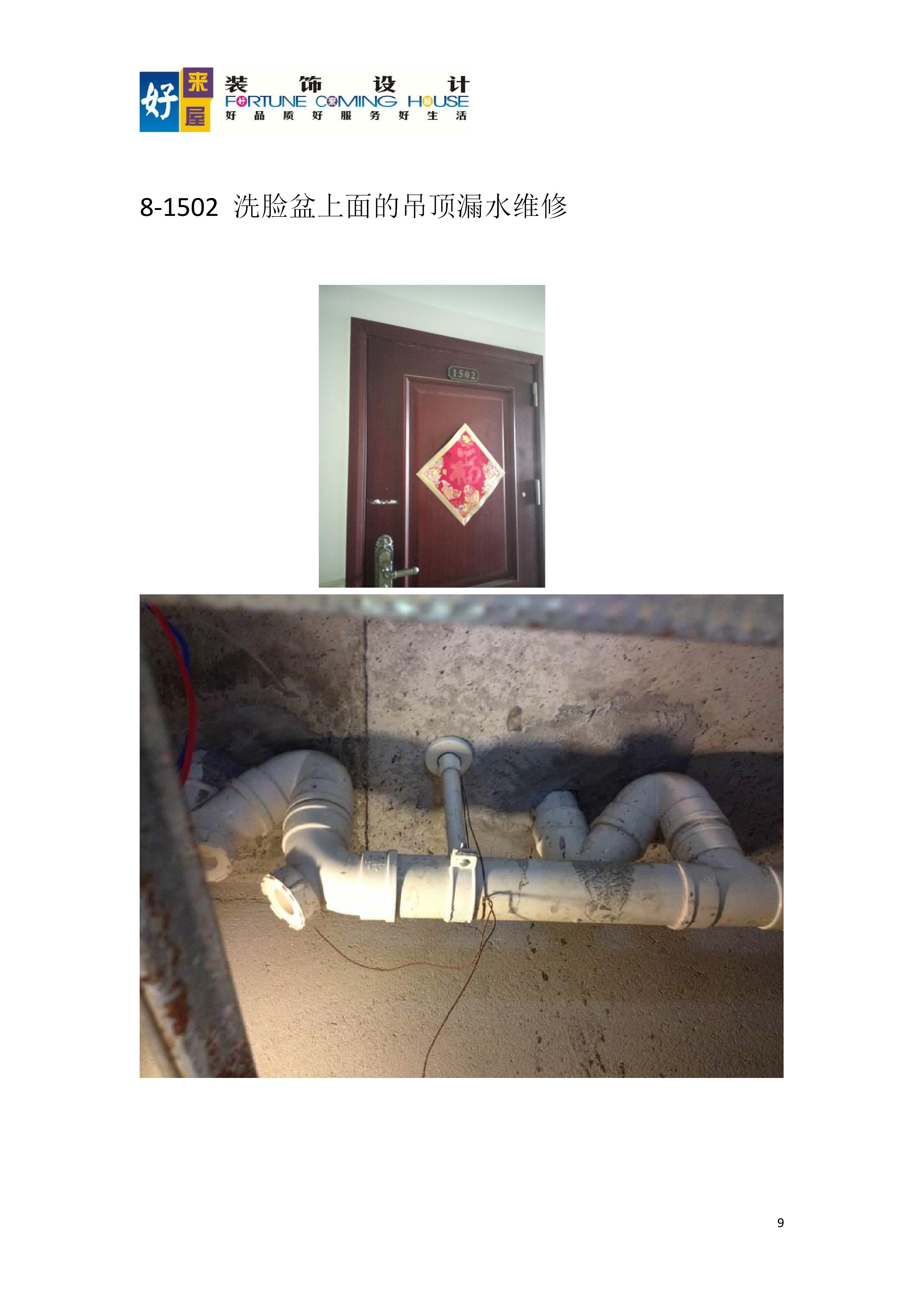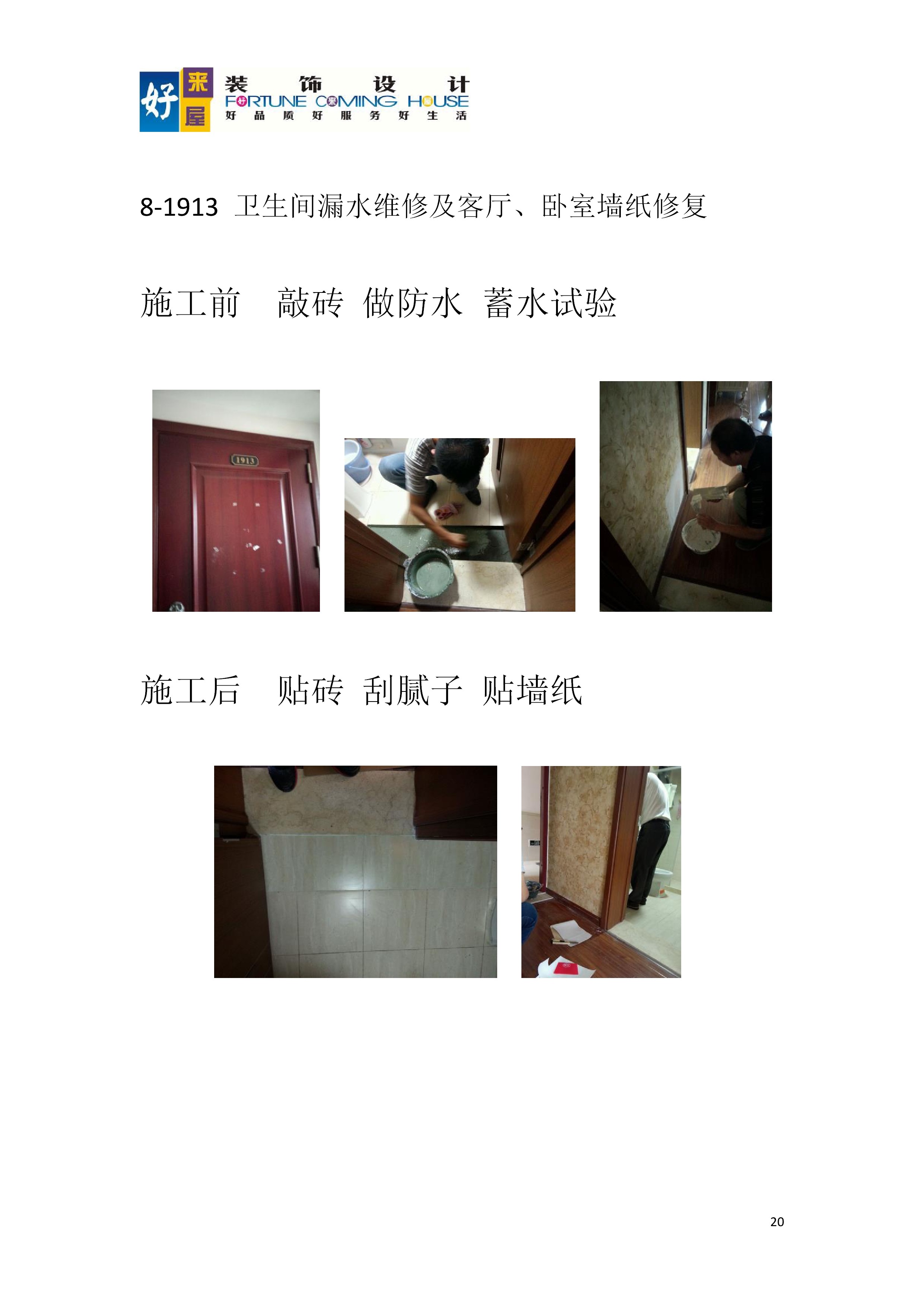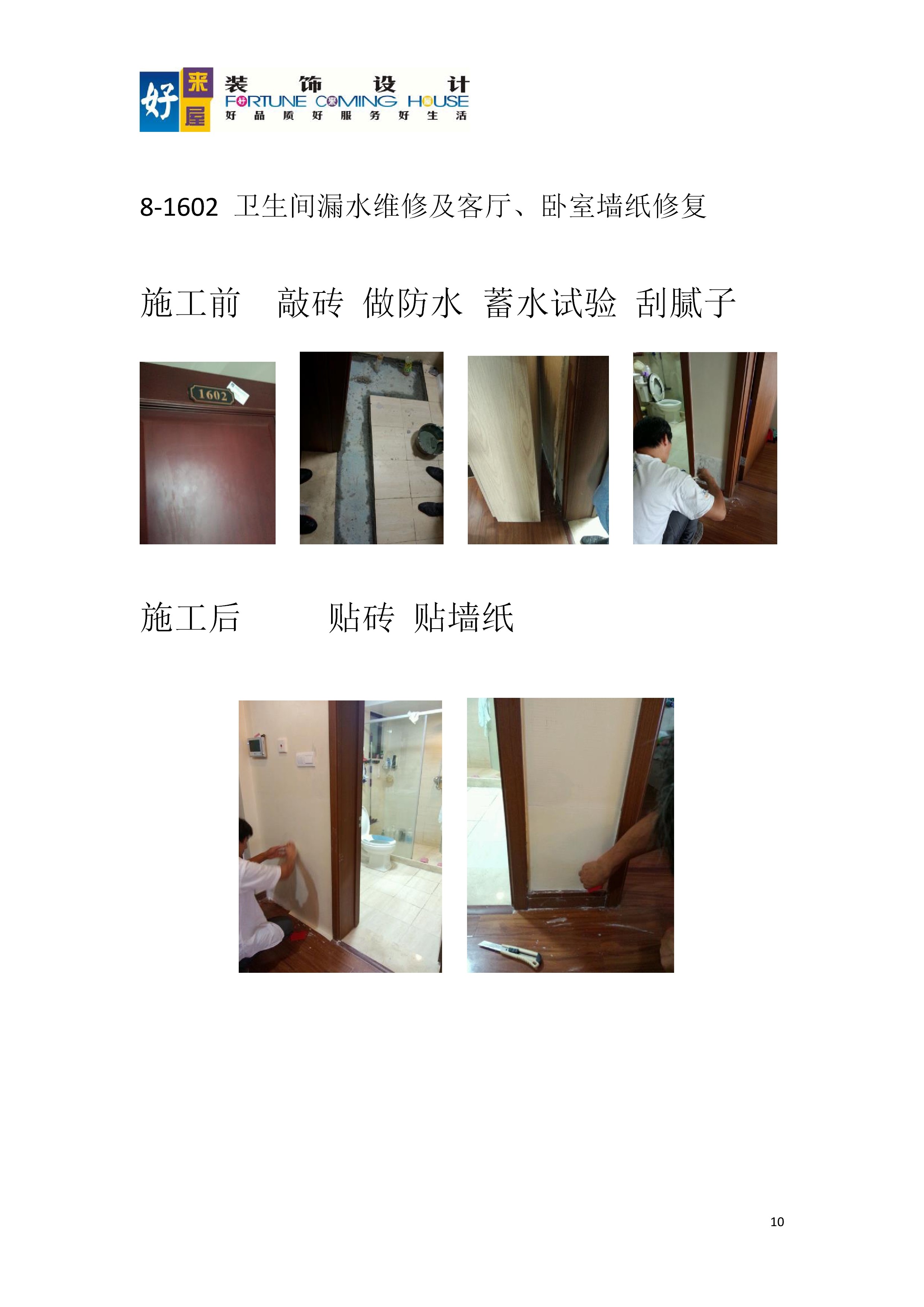 愛(ài)家國(guó)際華城我司施工總戶數(shù)為300戶,據(jù)我們現(xiàn)場(chǎng)施工人員統(tǒng)計(jì),存在漏水情況戶數(shù)為21戶,其中5家陽(yáng)臺(tái)漏水,16家衛(wèi)生間漏水。維修率占7%,漏水平均面積為1m2。我司在2014年8月16日接到愛(ài)家國(guó)際華城物業(yè)漏水維修電話后,在一個(gè)多月的時(shí)間里,快速的為客戶解決了房屋漏水維修問(wèn)題,體現(xiàn)好來(lái)屋高效率的辦事風(fēng)格。