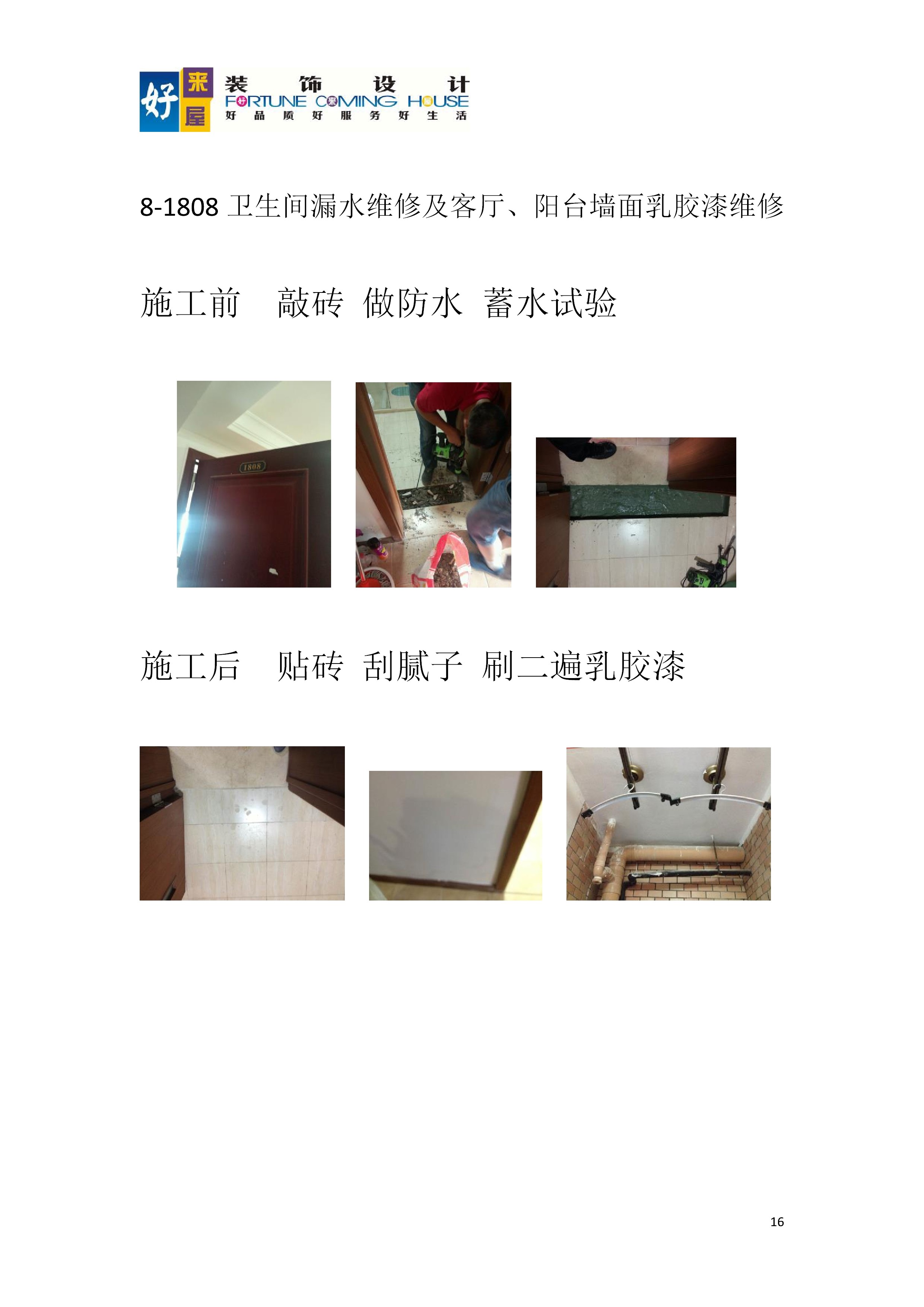 對(duì)于反映漏水情況的客戶,我們首先進(jìn)行現(xiàn)場(chǎng)查看,找出維修漏水的原因,衛(wèi)生間漏水主要是因?yàn)殚T(mén)檻石和衛(wèi)生間磚相連接之間的防水沒(méi)做好導(dǎo)致衛(wèi)生間使用時(shí)滲水,造成客廳、臥室墻面乳膠漆或者墻紙發(fā)霉,我們的解決方法是將衛(wèi)生間門(mén)檻石和衛(wèi)生間之間的磚敲掉,重新做防水,鏟除發(fā)霉的乳膠漆或墻紙,重新刮膩?zhàn)樱缓笞鲂钏囼?yàn),確認(rèn)墻面情況良好,無(wú)發(fā)霉的情況后,將衛(wèi)生間的磚恢復(fù)起來(lái)。關(guān)于陽(yáng)臺(tái)漏水的情況也是一樣的,我們首先找到陽(yáng)臺(tái)漏水的原因,是因?yàn)殛?yáng)臺(tái)的下水管道與磚之間的防水沒(méi)做好,我們同樣采用敲磚、做防水、蓄水試驗(yàn)、恢復(fù)磚的方法進(jìn)行修復(fù)。